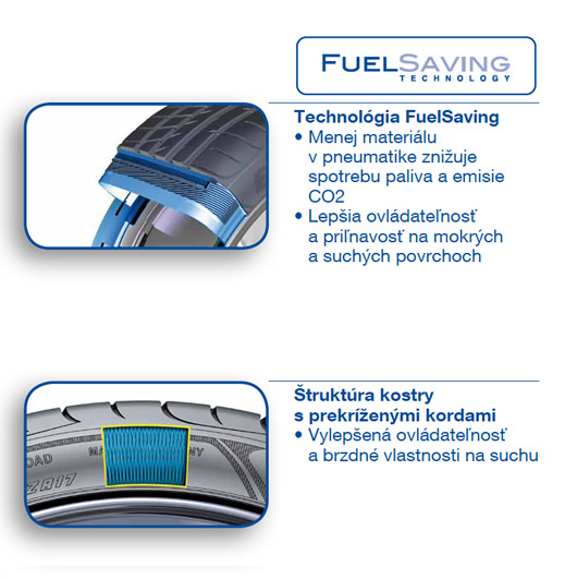 | Technologie FuelSaving | Less material in the tire + less heat to reduce rolling resistance | Reduces fuel consumption and CO2 emissions |