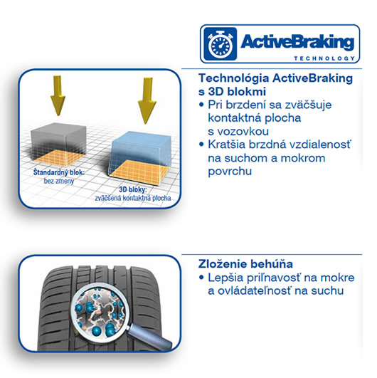 | The ActiveBraking technology | When braking, each block is under greater load and increases the contact area with the road | Shorter braking distance on wet as well as dry road |